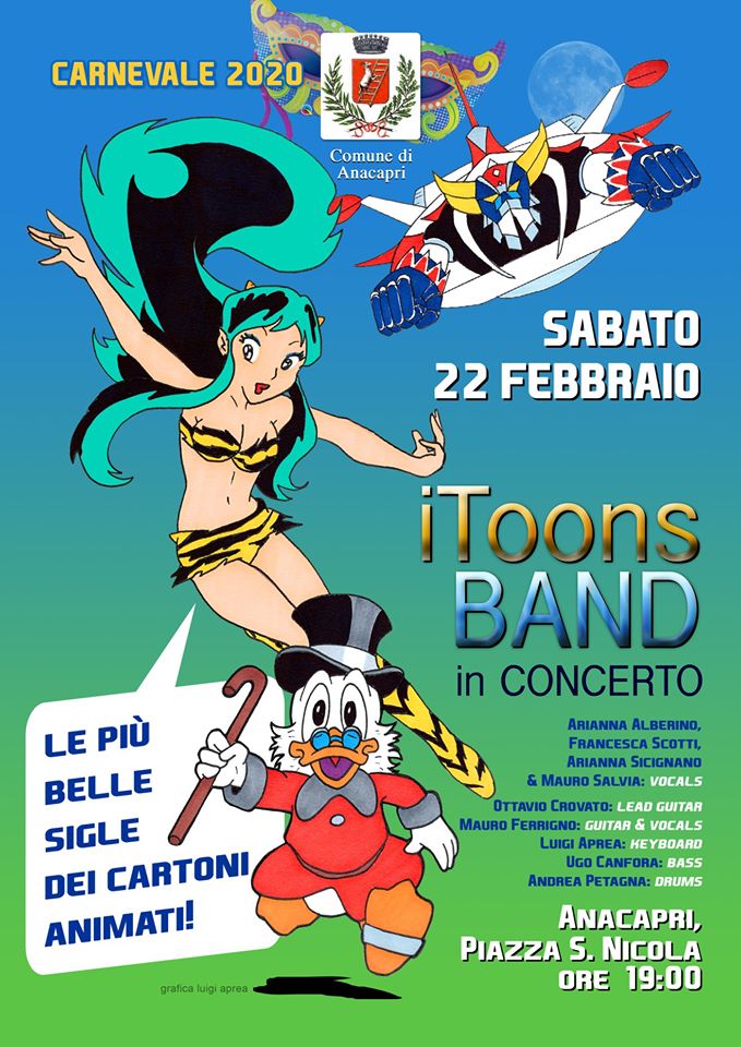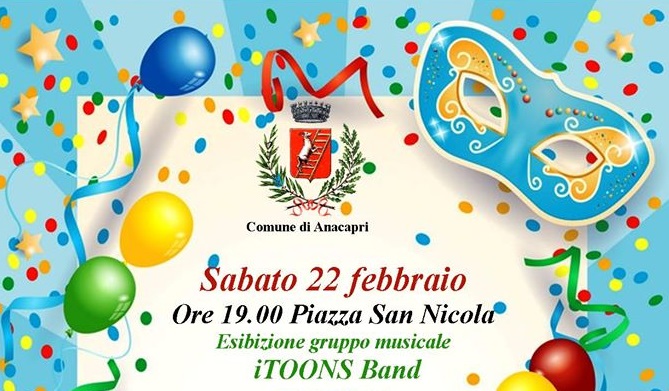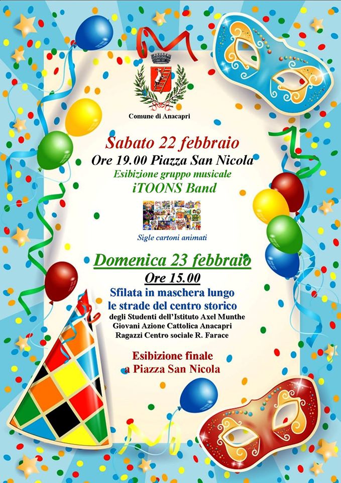 Carnevale ad Anacapri, l’amministrazione comunale ha annunciato gli appuntamenti del week emd. Sabato 22 alle ore 19.00 in piazza San Nicola esibizione del gruppo musicale iToons band che proporranno le più conosciute sigle di cartoni animati. Domenica 23 dalle ore 15, sfilata in maschera lungo le strade del centro storico degli studenti dell’Istituto Axel Munthe, dei giovaniu dell’Azione Cattolica di Anacapri e dei ragazzi del Centro Sociale R. Farace. Esibizione finale in piazza San Nicola.