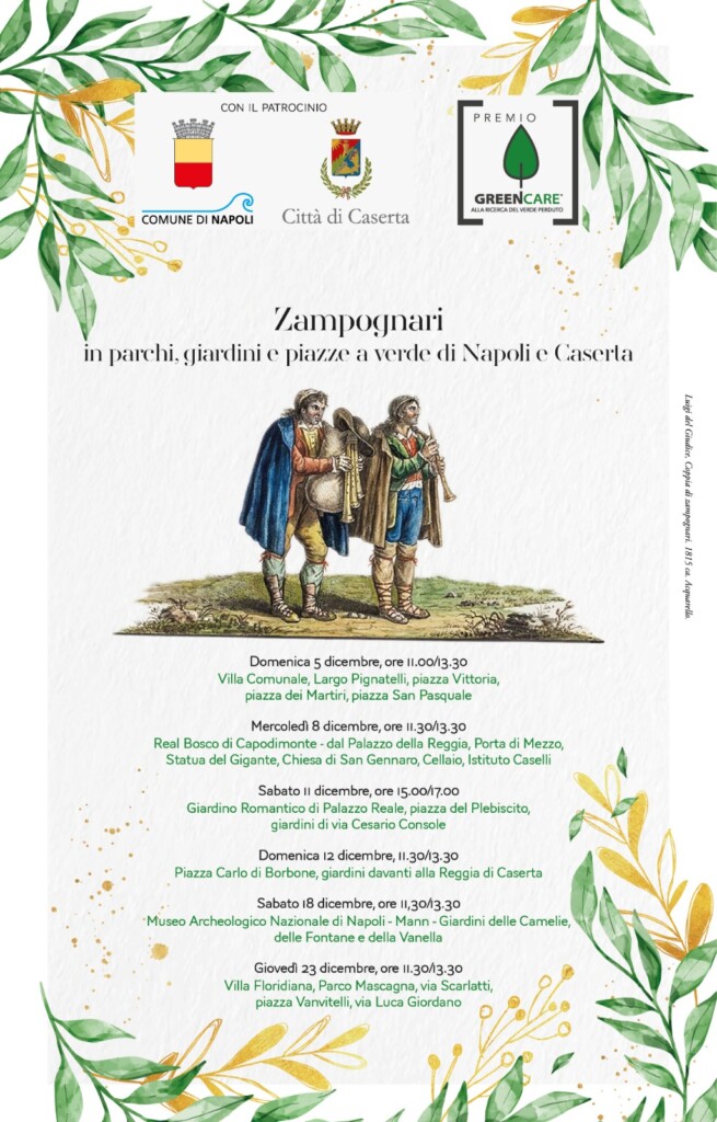 Il ciclo d’interventi musicali ad opera di zampognari professionisti ha il patrocinio morale dei Comuni di Napoli e Caserta. Prenderà avvio domenica prossima, 5 dicembre, alle ore 11 nei pressi della Cassa Armonica della Villa Comunale di Napoli, alla presenza del presidente di Premio GreenCare, Benedetta de Falco e dell’assessore alla Salute e al Verde del Comune di Napoli, Vincenzo Santagada.